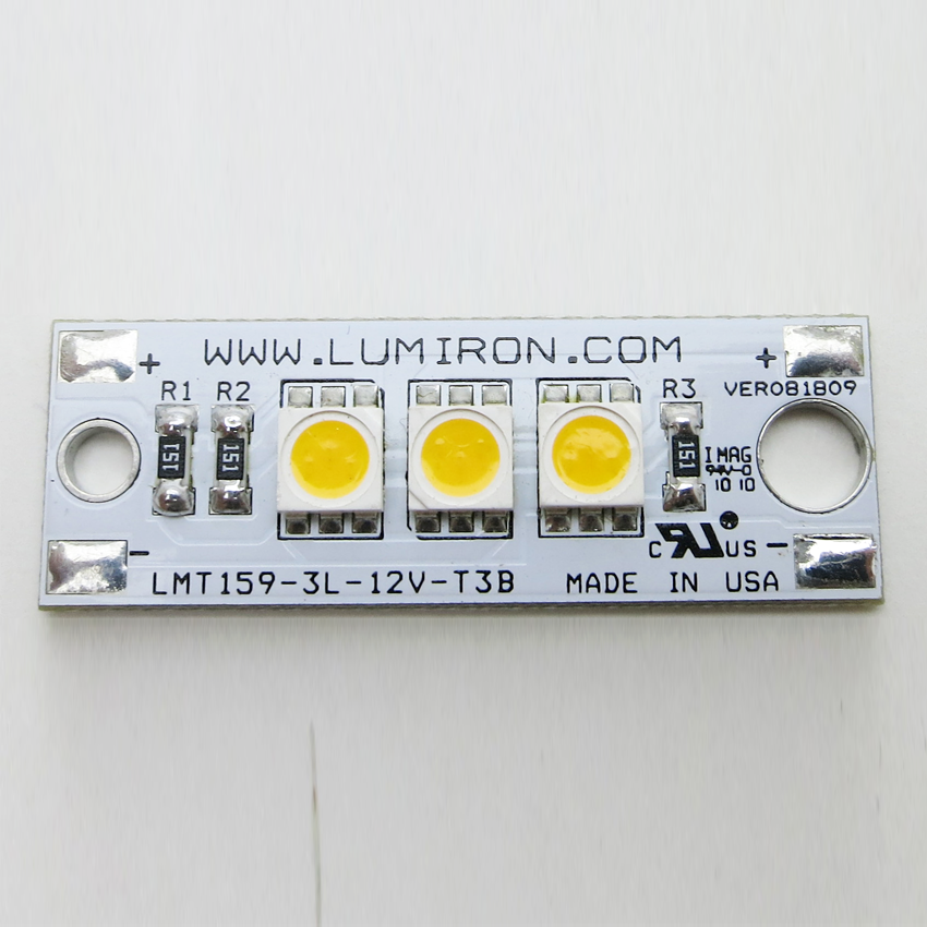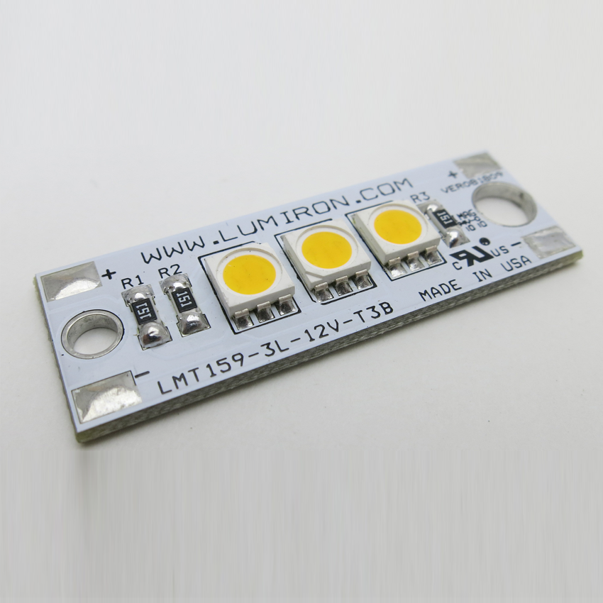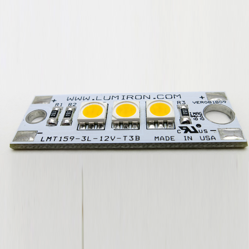 The LUMIRON Lumos LMT-159-3L-T3 is a high-grade, 1 5/8” by 9/16” rectangular module, designed to produce outstanding dimmable lighting solutions for marine, architectural as well as new fixtures for all applications. It is a great retrofit on small marine courtesy lights or any small linear fixture for commercial, domestic, or designer application. This LED has excellent lighting applications in multiple whites or colors; while reducing the impact on the environment, it offers you a solution to many of your lighting needs. The Lumos LMT-159-3L-T3 has a considerably low power usage using 12VDC AND 0.75 WATTS per module. LEDs have lower heat emission and no UV or Mercury. That makes it a cost-effective, environmentally conscious product with a lifetime of about 50,000 hours of use. It is a solid-state lighting solution that has gone through our rigorous in-house testing and comes with a 3-year warranty.